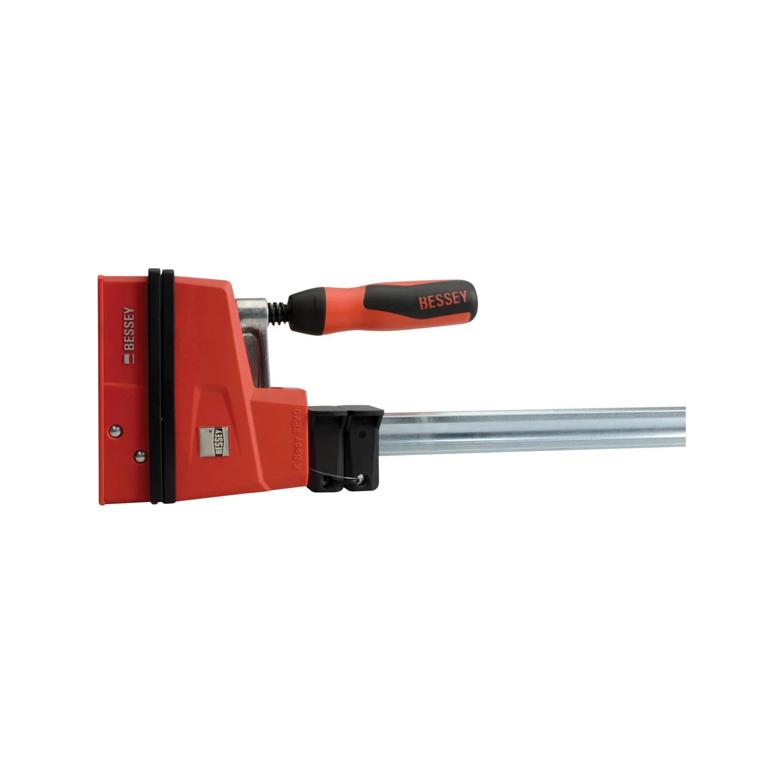 The Bessey K Body Parallel Jaw Clamp REVO KRE offers powerful clamping and spreading over large surfaces with clamping forces of up to 8.000N. With extremely large parallel clamping surfaces. Fitted with 2 removable pressure caps to help protect the surface, they are repellent to glue, paint and grease solvents. The metal reinforced plastic housing features an optimised sliding arm with double slide protection for more power and safety. The set clamping force is maintained and the sliding arm cannot unintentionally slip in the unclamped condition. Can be quickly and easily converted without tools for spreading tasks. Fitted with a high-quality 2-component symmetrical plastic handle, with a hexagon socket for ultimate comfort and quick and easy application of the clamping force.