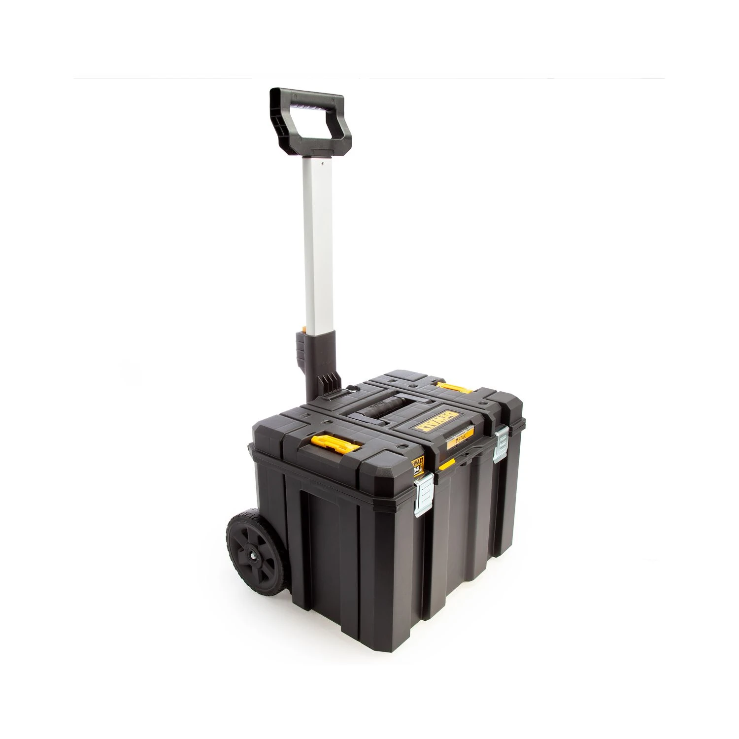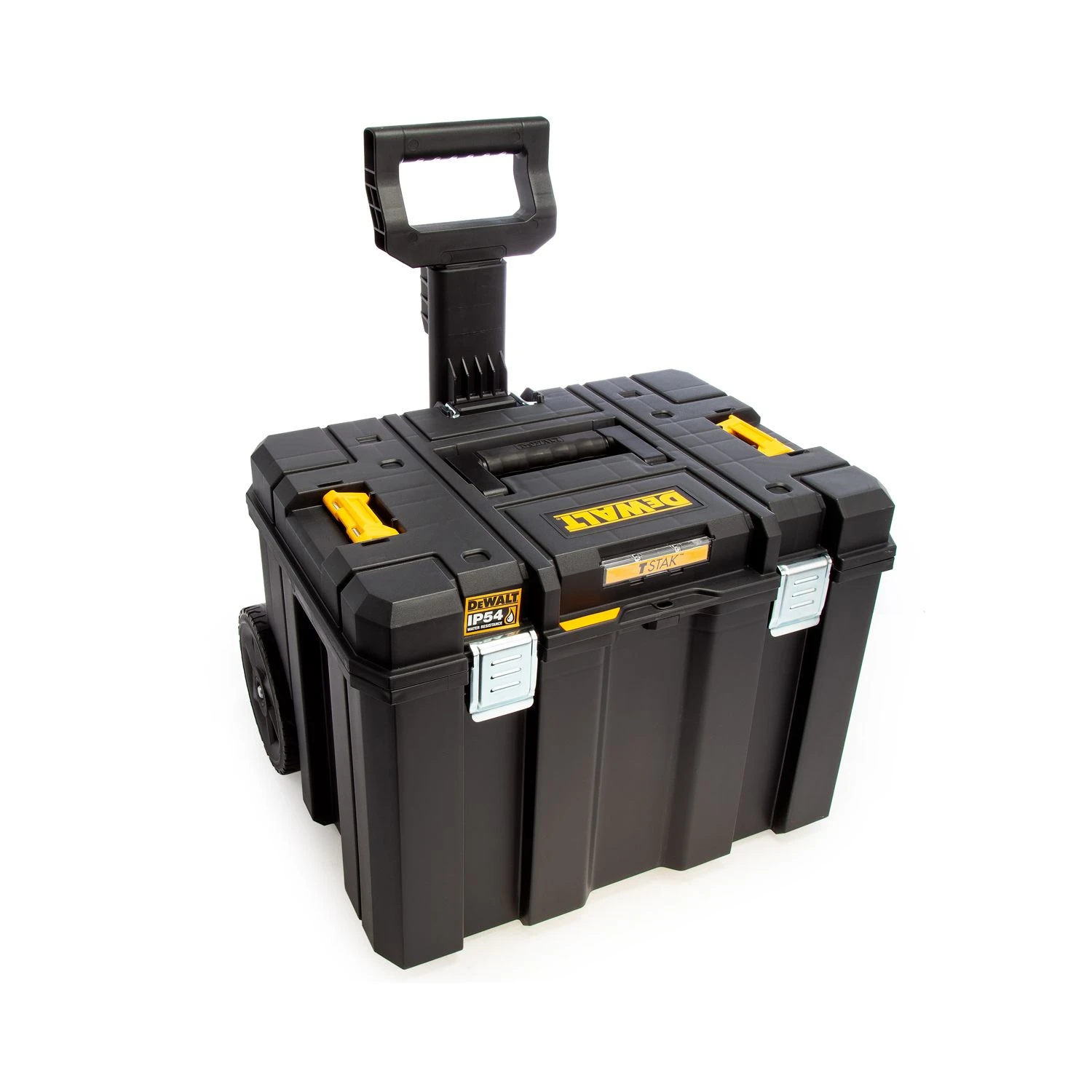 The Dewalt DWST83347-1 TSTAK 2.0 Stackable Mobile Storage Box is part of the upgraded TSTAK Range with an IP54 rating providing water and dust protection to fixings and tools inside. Fitted with rugged 7 inch wheels and a telescopic handle. The Box is Dewalt Tracker Ready with a fixing point built in to allow a Tracker to be installed and the box tracked via DEWALT Tool Connect. Compatible with all TSKAK products.