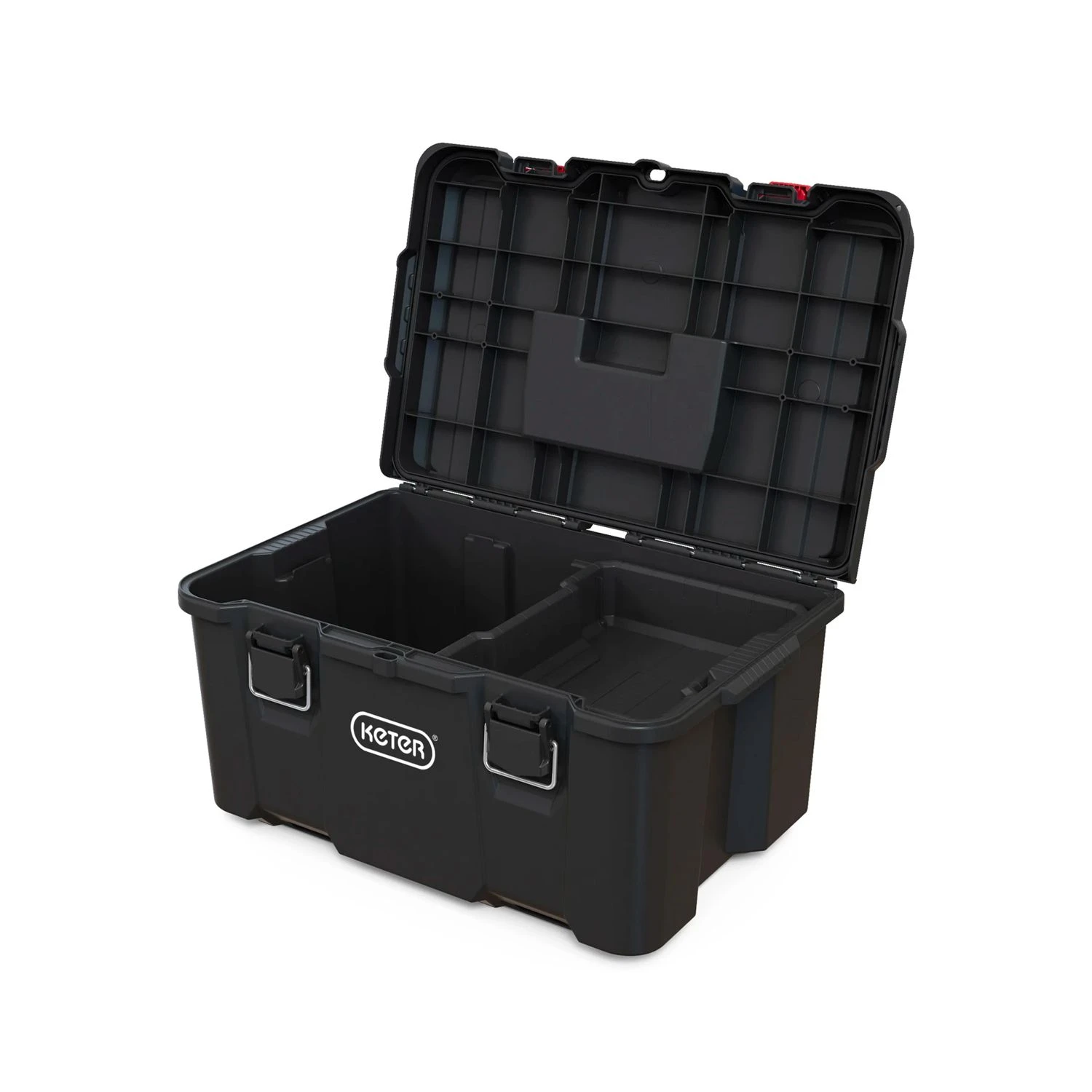The Keter Stack N Roll Tool Box is made from durable polypropylene resin for reliable everyday usage. Its deep main compartment is ideal for storing power tools and batteries. Heavy-duty metal latches allow you to securely fasten the lid with audible closing indication. Comes with a portable cross-system tray for increased organisation.
