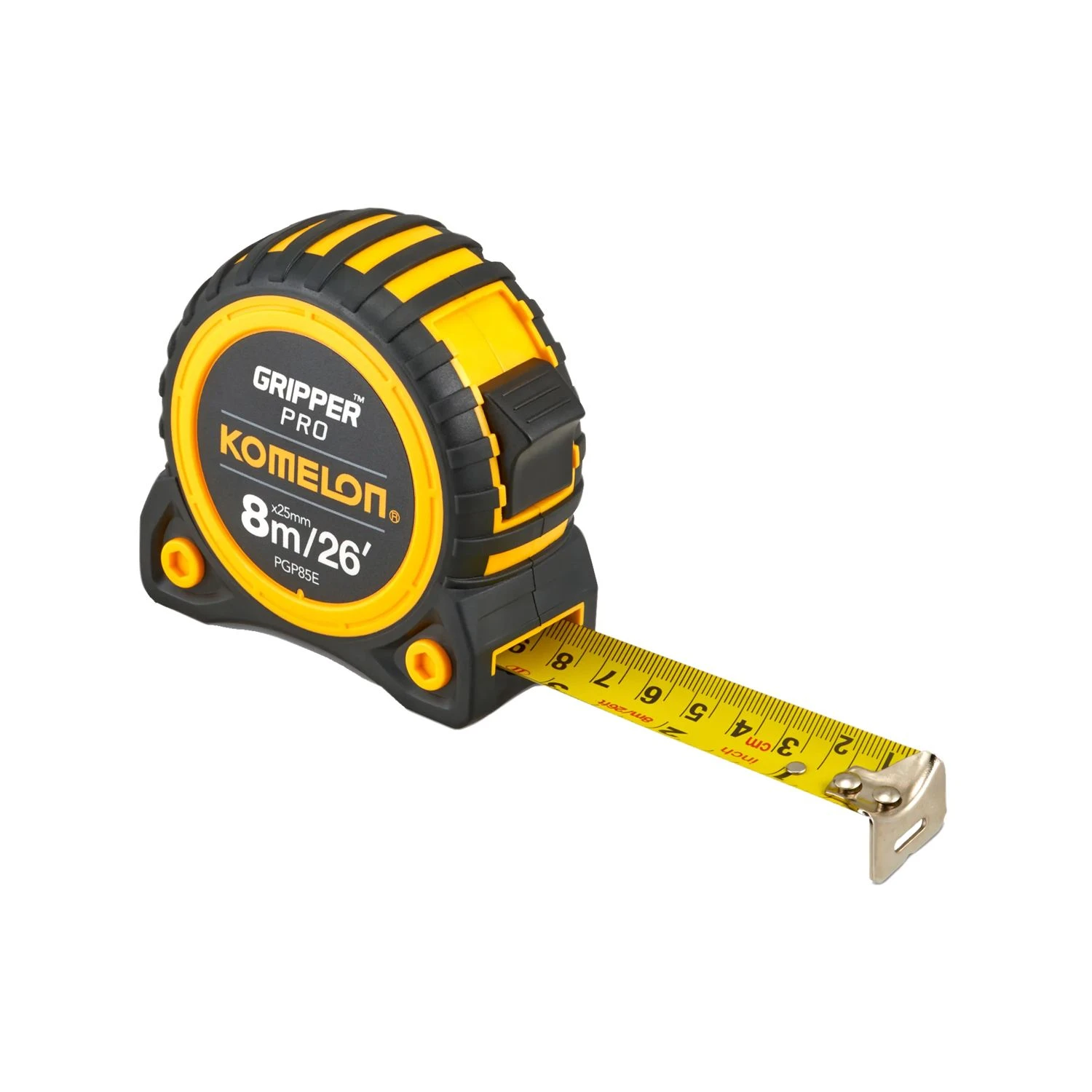The Komelon Gripper™ Tape has a durable, nylon-coated blade with a true zero end-hook and a top blade lock. The blade features both metric and imperial markings.