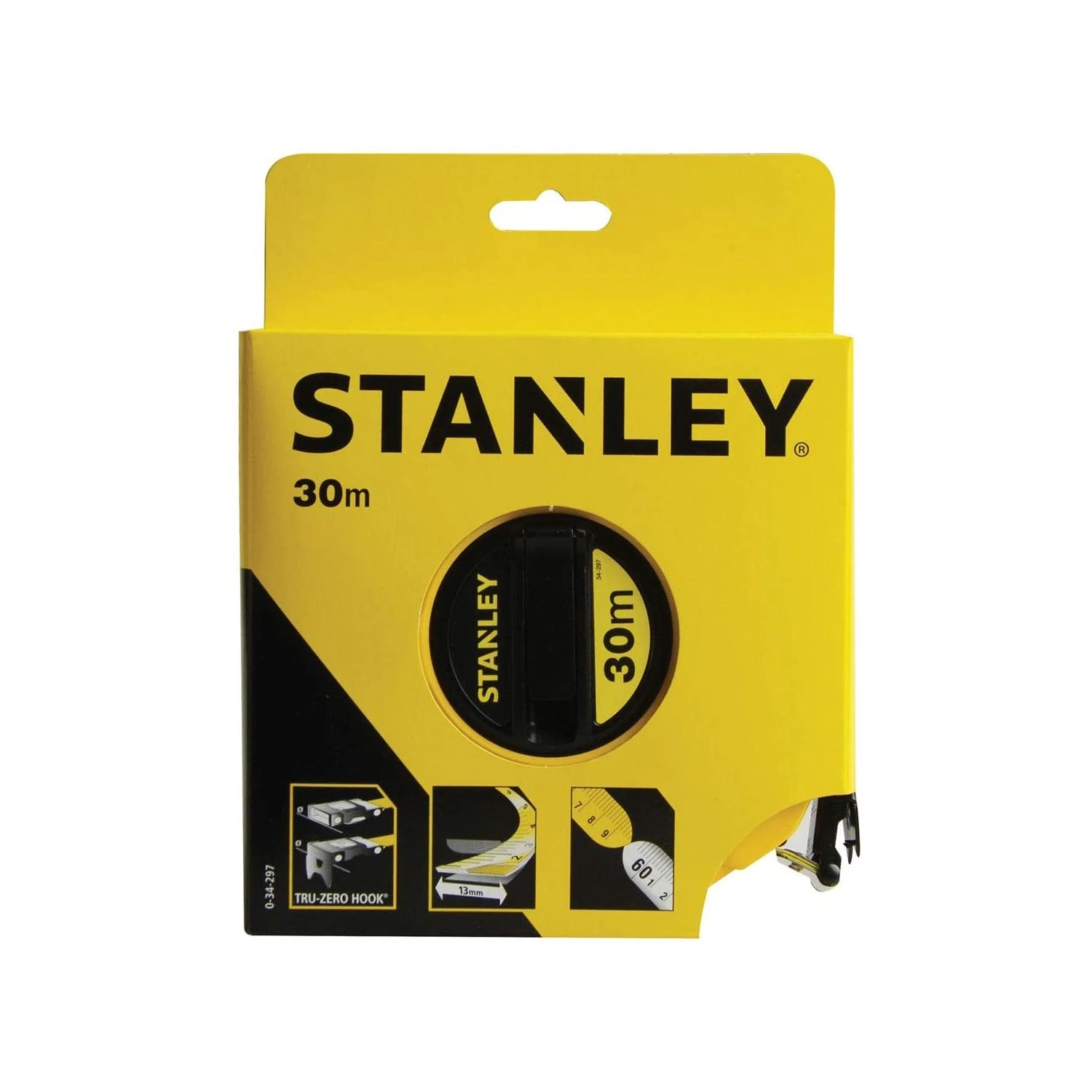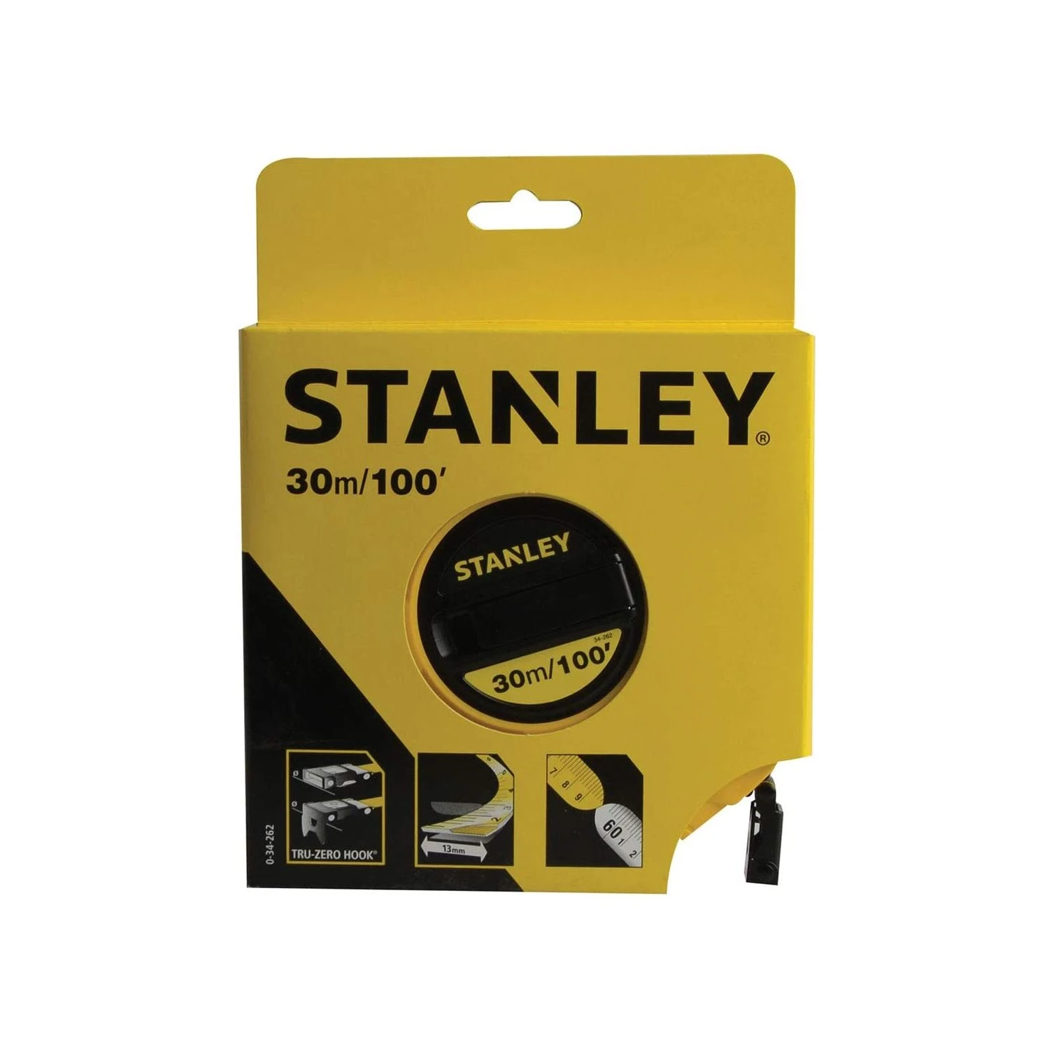 A STANLEY long tape in high impact ABS closed case to withstand severe work conditions. Case perforated at rear to allow the tape to be cleaned. Reinforced fibreglass tape – reduces elasticity and improves measuring accuracy. Featuring white surface with 2mm graduations for precise measuring . This corrosion-resistant UV protected non-conductive tape is highly resistant to site drainage. Class III tape blade has washable pvc coating to increase life.