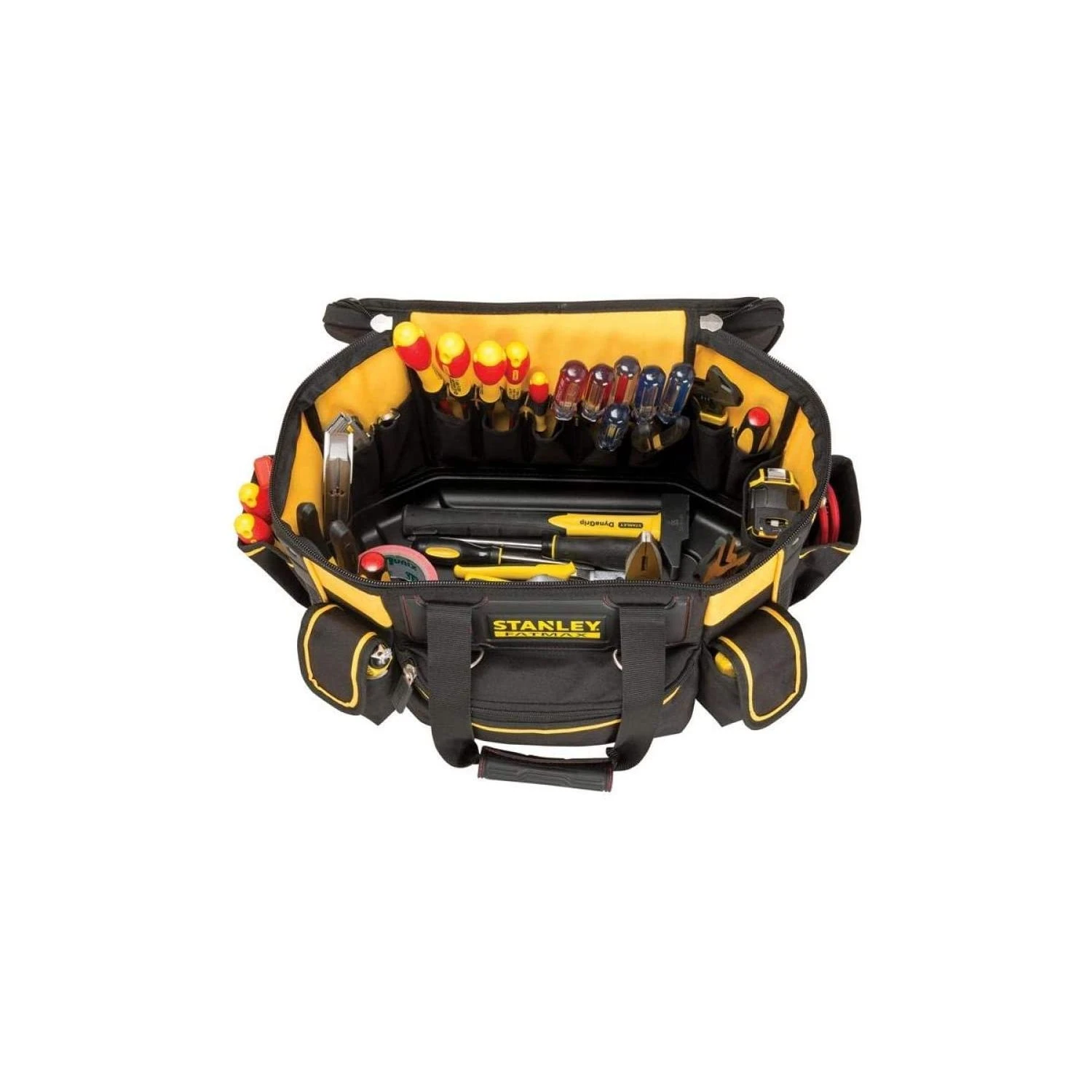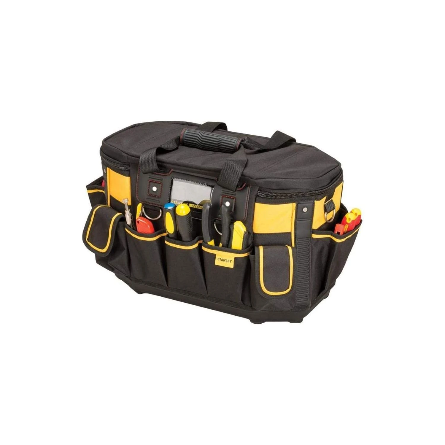 The STANLEY FATMAX 18 Inch Round Top Rigid Tool Bag is made of durable materials for internal protection against tool damage. The internal round top design produces a high amount of storage capacity in comparison to traditional bags. The ergonomic padded shoulder strap and rubber grip handle allows for easier carrying of heavier loads.