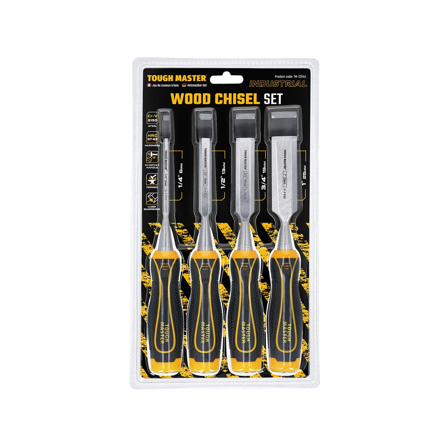 If wood carving tools are essential for your work, then you know that you need a dependable wood chisel set. So make sure you have a set of wood carving chisels you can trust – this set of 4 wood chisels from TOUGH MASTER®. Each chisel blade is forged from high-carbon Cr-V steel, selected for its ability to hold an edge so that each chisel blade in this wood chisel set stays sharper for longer; that way, you spend more time working and less time sharpening. A lacquer coating prevents rust and lubricates each blade for smoother, dependable function. The sharp precision-ground blades have a hardness up to HRC63, plus narrow side bevels, guaranteeing a lifetime of useful performance. The handles are manufactured with a hardened internal steel rod and finished with a steel strike cap, so these wood carving chisels withstand powerful impact forces such as hammer or mallet blows without breaking. Each chisel in this wood chisel set offers a secure, comfortable hold, thanks to the full-size handles with their non-slip rubberised handle grips, which ensure long-time comfortable use. Each chisel blade has a damage-resistant plastic blade sleeve to prevent accidental injury and protect the blade from damage. When you’re finished with each chisel, simply place the plastic blade cover back on and store the wood chisel away, ready for the next use.