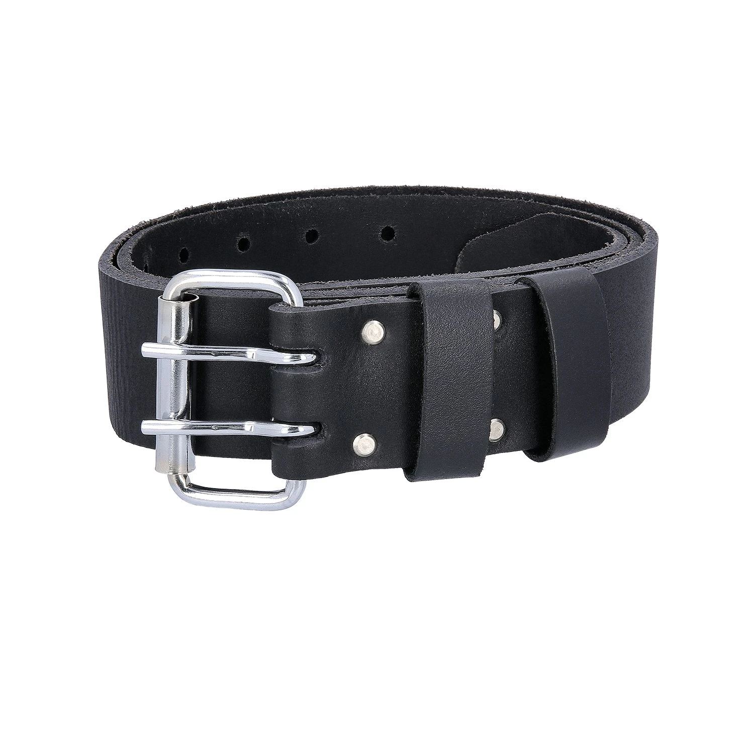 - Sturdy design: TOUGH MASTER®’s heavy-duty leather belts are sturdy and reliable. This black leather belt has a double-pin prong metal roller buckle with a size range from 31″” up to 46″”, meaning it can fit securely on people of different shapes
