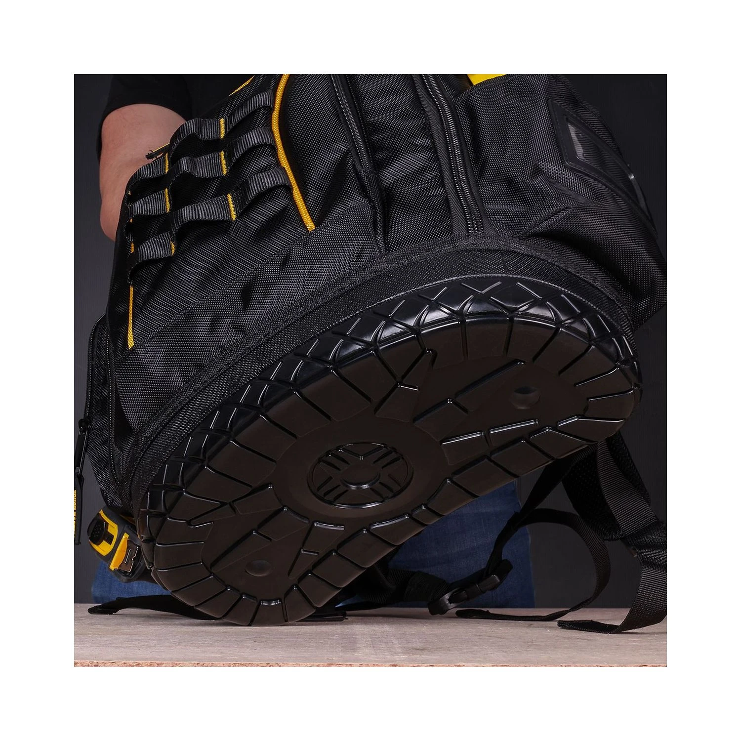 - Heavy-duty rubber base: This tool bag has a sturdy moulded rubber base which can protect belongings from damp and dirty surfaces. It also keeps the tool box backpack upright to ensure everything stays firmly in their pockets – that means no more spillages when you are carrying liquids. Its crisscrossed pattern gives a contemporary yet practical look against the yellow stripes.