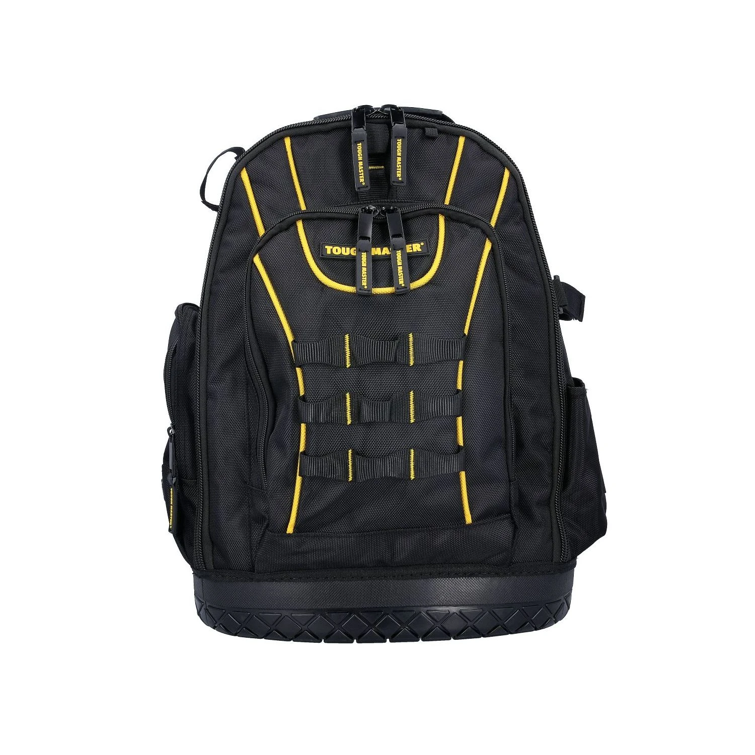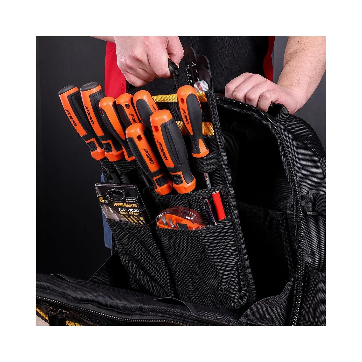 Get your tools at the ready with this heavy-duty 18″ TOUGH MASTER® Multi-Pocket Tool Storage Backpack Tool Bag, featuring a 9-pocket, 6 loop pull-out tool organiser, convenient for separating your personal belongings from your screwdrivers. Impress your fellow tradesperson with its water-resistant, multi-layered 1680D polyester fabric coating, a world away from the conventional 600D, as well as its carefully designed double stitching and rubberised handle grip. With this professional tool backpack, you’ll protect your valuables from damage, as it possesses a sturdy rubber base, as well as a foam layer for extra cushioning. You’ll find even more to rave about as you discover its 12 total pockets, including a padded laptop pocket inside, created to store any laptop up to 17″, as well as another deep pocket and 8 pockets inside one of the two compartments. Outside, expect ease of access to your measuring tape and rolls of cable with a reinforced Nylon hook and riveted tape holder. Other features of the tool bag include straps for hanging clasps, dual rubber zipper pullers, adjustable shoulder straps, and 2 outer pockets, including a deep side pocket for your water bottle or umbrella.
