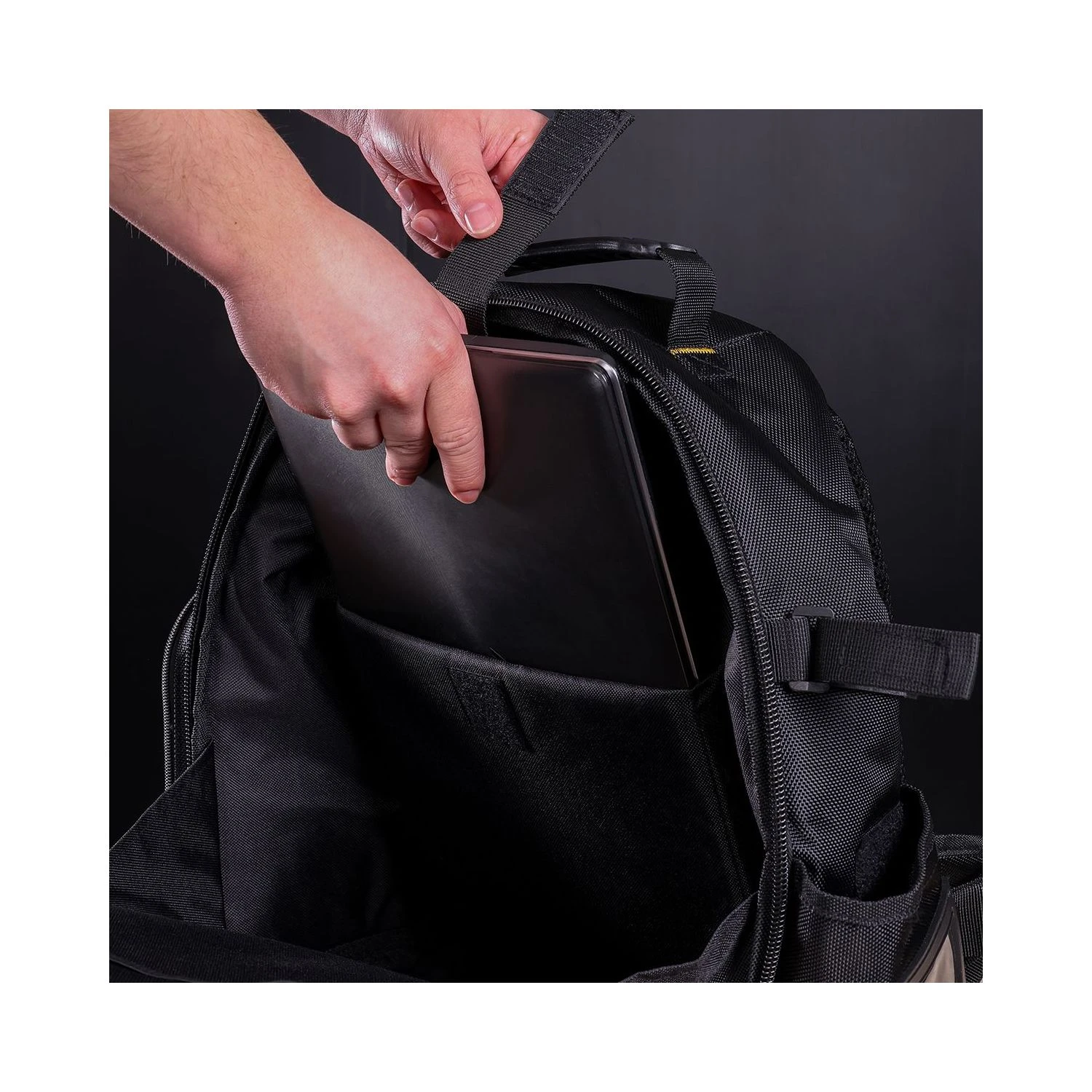 - Multi-pocket: This professional tool backpack holds 12 pockets designed with specific functions in mind: 2 outer pockets, and 2 compartments, including a side pocket with a velcro strap to secure water bottles and other similarly shaped items, another side pocket with a measuring tape holder and cable strap, as well as a front compartment. The inner part contains 10 pockets: 2 deep pockets, including a 17″ padded laptop pocket, and 8 pockets inside the front compartment.