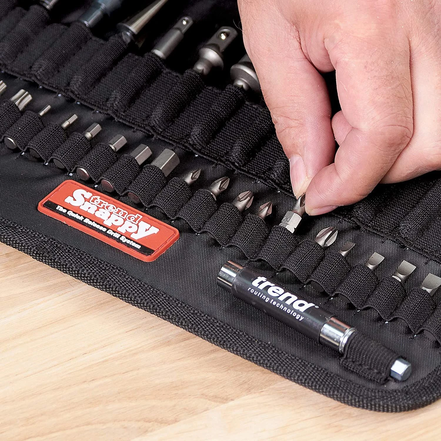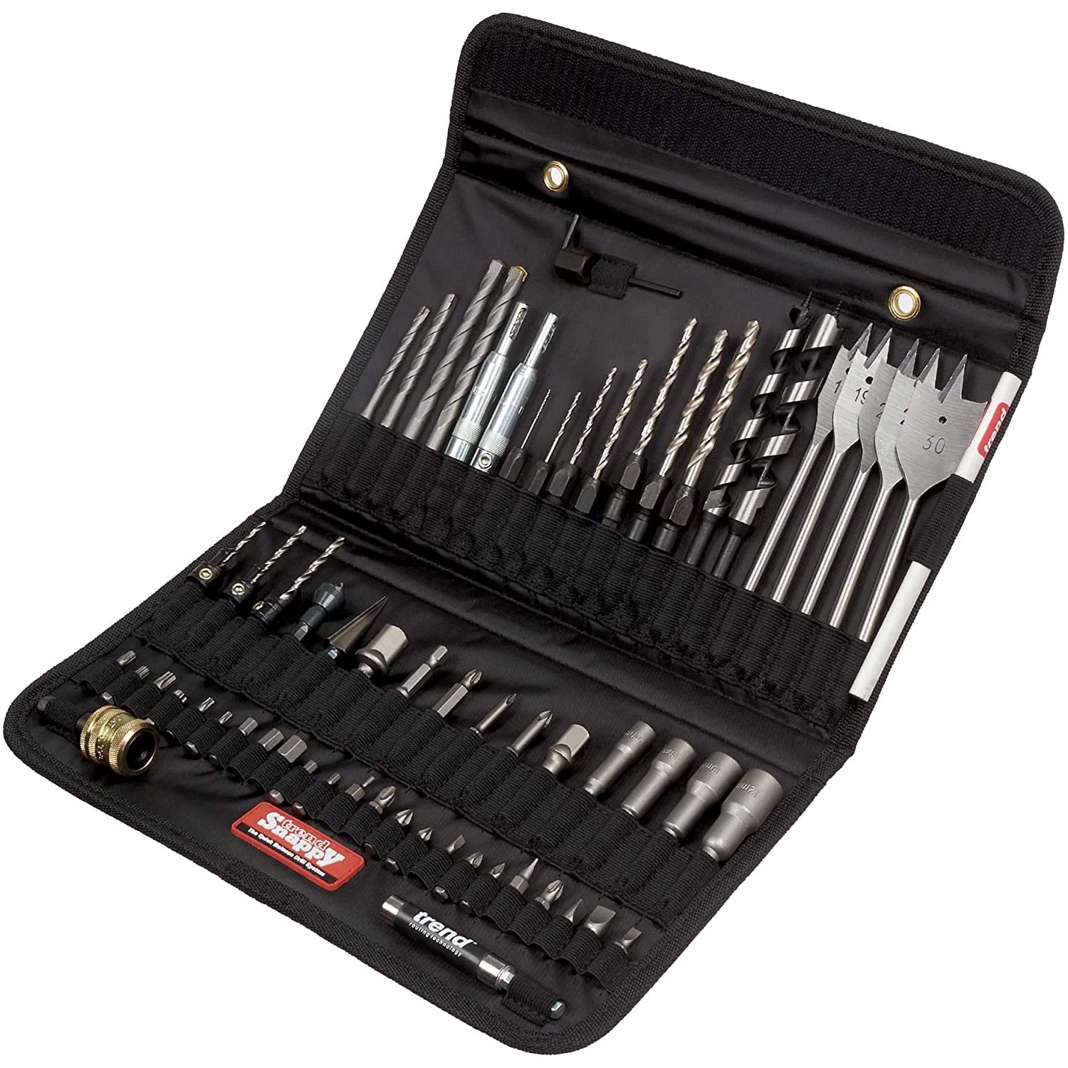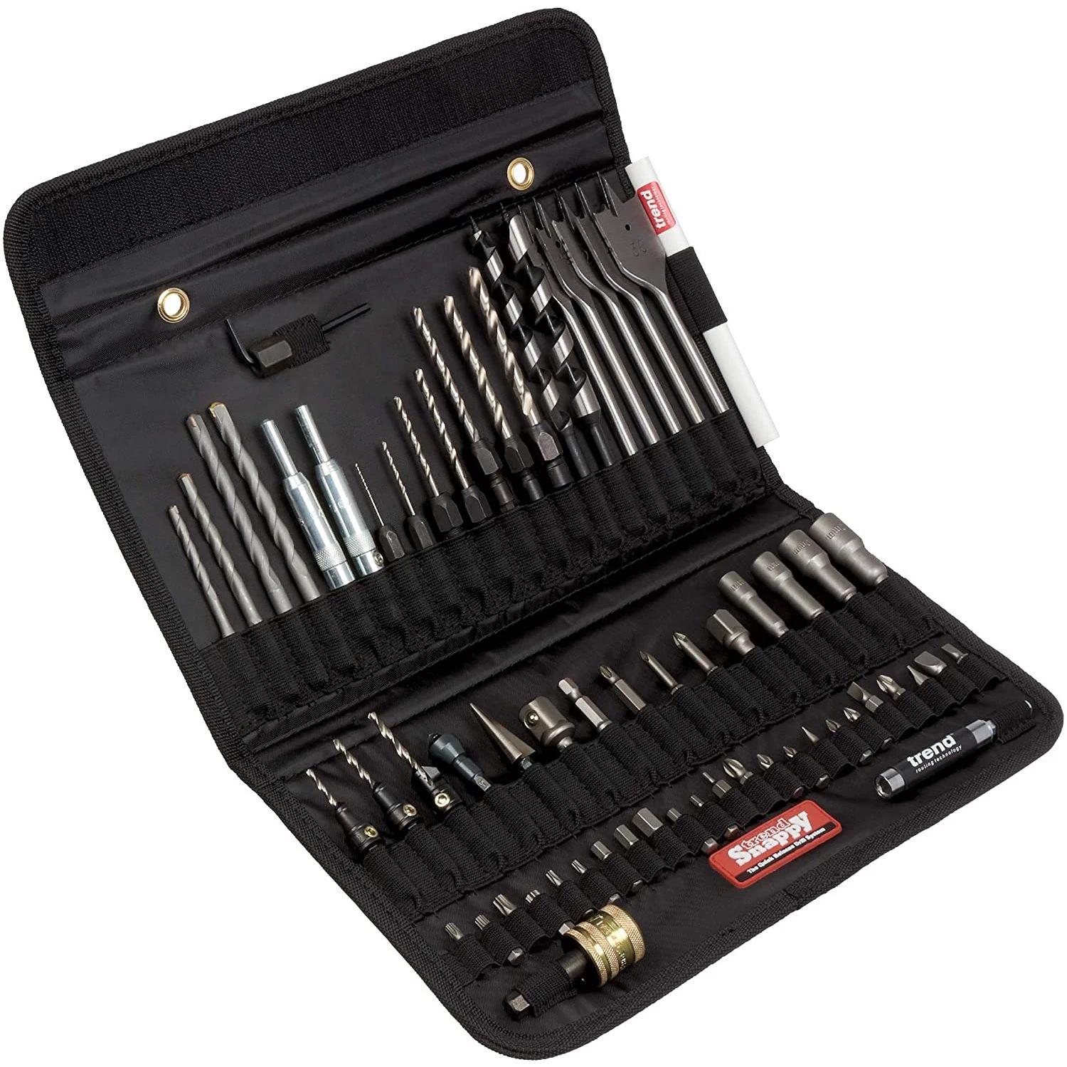 This heavy-duty fabric tool holder come with an assortment of useful, Snappy tools. Included in the set: Standard Quick Chuck; Masonry bits 5-8mm; Drill bit guide 6 and 8; Drills 1-7mm; Auger bits 10 and 13mm; Flat bits 16, 19, 22, 25 and 30 mm; Drill countersinks 2.5, 3.25 and 3.5mm; Deburrer/countersink; Hole enlarger; Square drive adapter 1/4,3/8 and 1/2in; Screwdriver bit Pozi 1-3; Magnetic drivers 6, 8, 10 and 12 mm; A/F; Snappy Pencil; Insert bits; Magnetic bit holder (including 5 slotted 3 Pozi, 3 Phillips, 6 hex and 6 Torx).