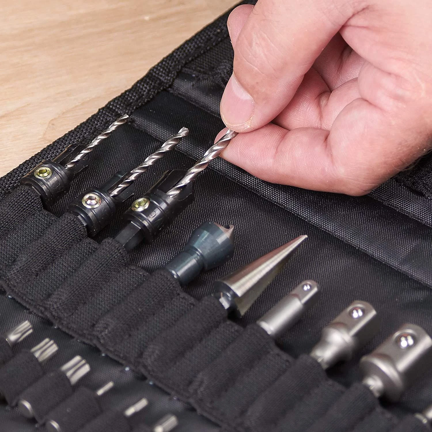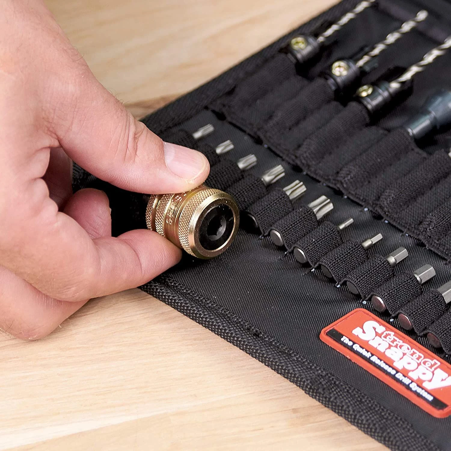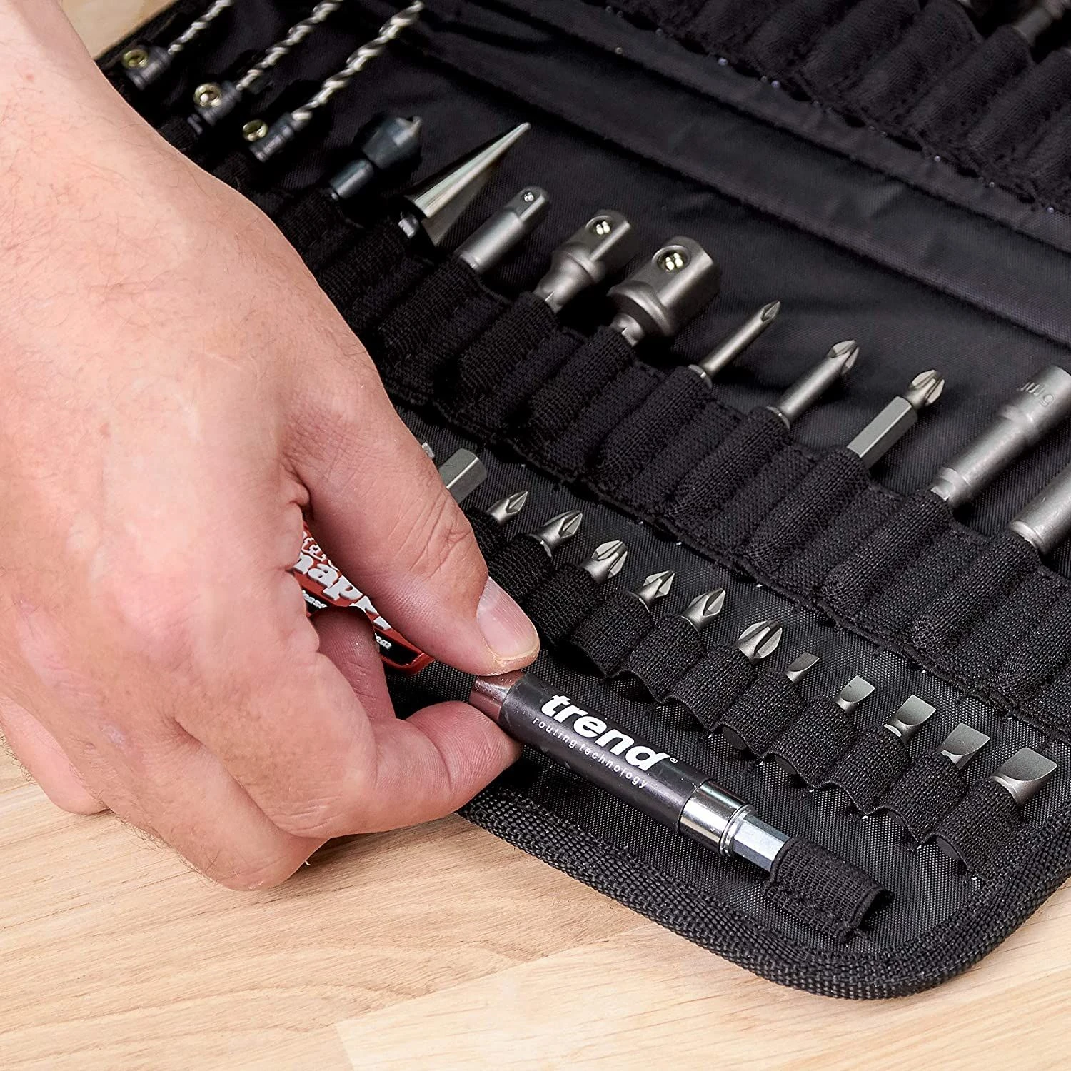 This heavy-duty fabric tool holder come with an assortment of useful, Snappy tools. Included in the set: Standard Quick Chuck; Masonry bits 5-8mm; Drill bit guide 6 and 8; Drills 1-7mm; Auger bits 10 and 13mm; Flat bits 16, 19, 22, 25 and 30 mm; Drill countersinks 2.5, 3.25 and 3.5mm; Deburrer/countersink; Hole enlarger; Square drive adapter 1/4,3/8 and 1/2in; Screwdriver bit Pozi 1-3; Magnetic drivers 6, 8, 10 and 12 mm; A/F; Snappy Pencil; Insert bits; Magnetic bit holder (including 5 slotted 3 Pozi, 3 Phillips, 6 hex and 6 Torx).